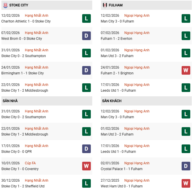 Thống kê phong độ Stoke City vs Fulham: