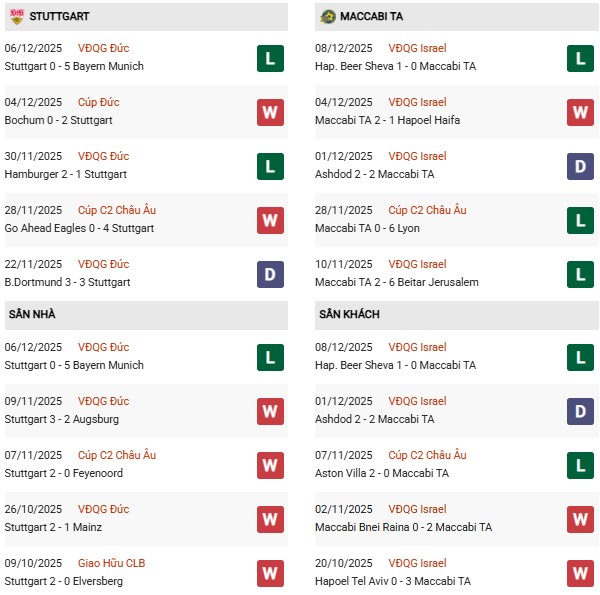 Thống kê phong độ Stuttgart vs Maccabi Tel Aviv: