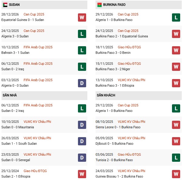 Thống kê phong độ Sudan vs Burkina Faso: