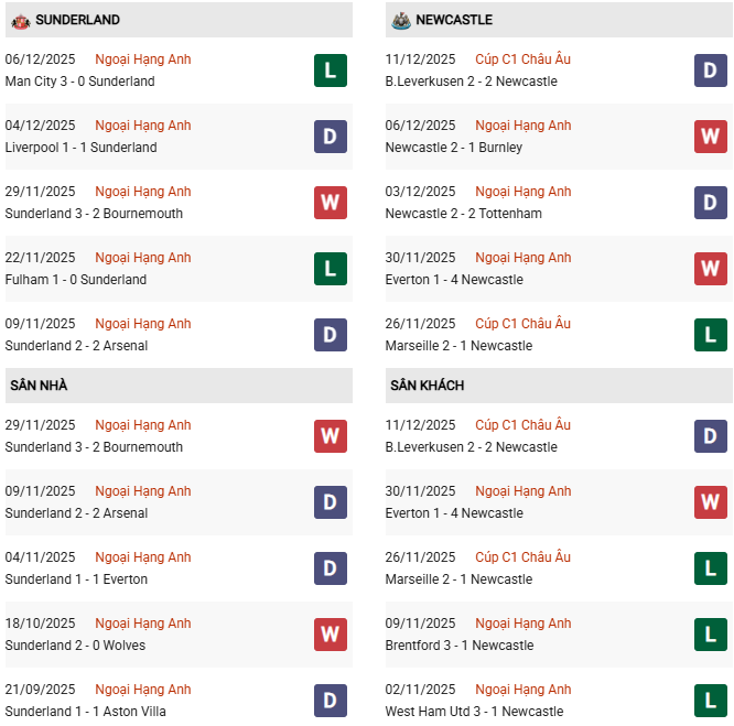 Số liệu thống kê về Sunderland gặp Newcastle: