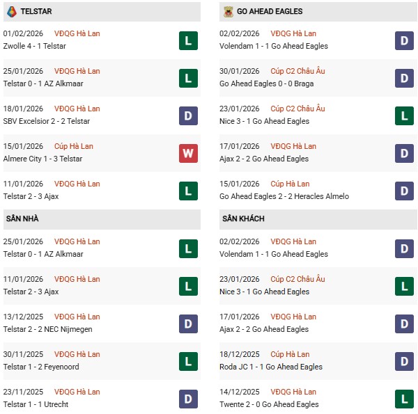 GA Eagles đứng thứ 7 mùa giải trước tại hạng đấu cao nhất của Hà Lan, vị trí rất ổn nếu so với những gì đội bóng của HLV Melvin Boel đang thể hiện mùa này. Họ đang đứng thứ 14 và hơn nhóm xuống hạng 5 điểm, đây là khoảng cách không hề nhỏ với các đội top cuối. Chính vì vậy, họ có thể dồn nhiều sức vào đấu trường cup Quốc gia. Làm khách trên sân của một Telstar không có phong độ tốt là cơ hội để GA Eagles tìm lại niềm vui chiến thắng.