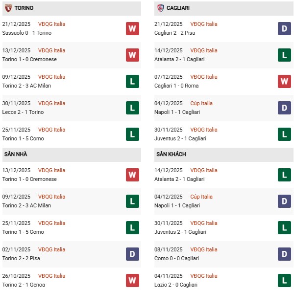 Thống kê phong độ Torino vs Cagliari: