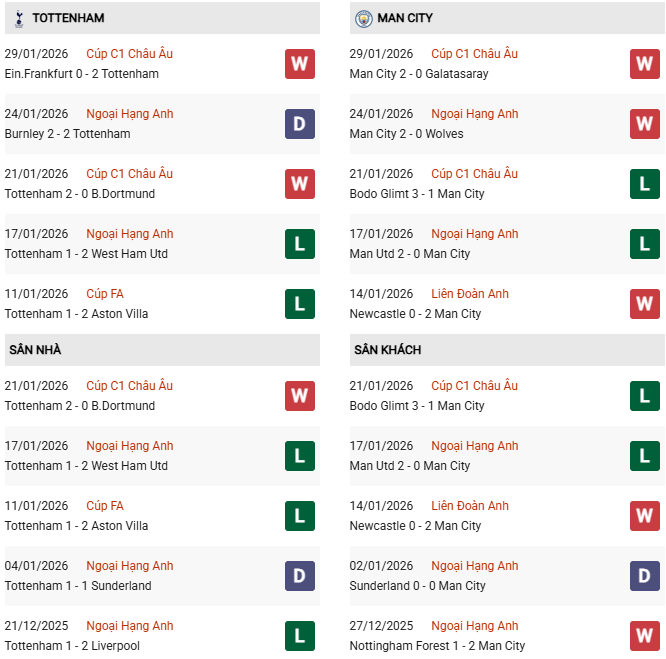 Thống kê phong độ Tottenham Hotspur vs Manchester City: