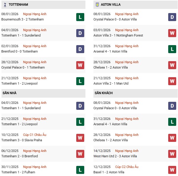 Lịch sử đối đầu trong 5 trận gần nhất đang nghiêng hẳn về phía đội khách. Aston Villa đã giành chiến thắng trong cả 3 lần chạm trán gần đây nhất giữa hai đội, bao gồm cả chiến thắng 2-1 ngay tại sân của Tottenham vào tháng 10/2025. Với phong độ trái ngược và tâm lý hưng phấn, Aston Villa hoàn toàn đủ khả năng ca khúc khải hoàn ngay tại London.