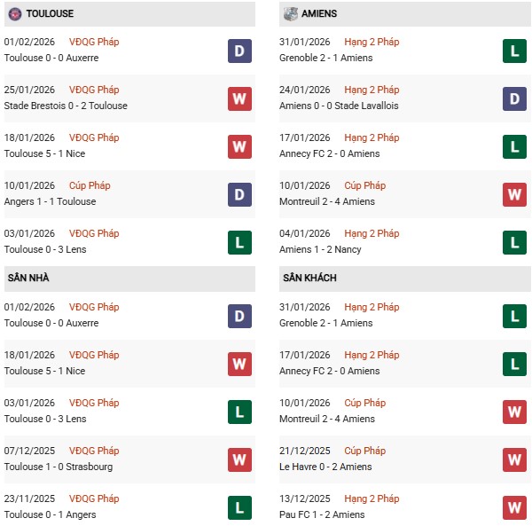Đặc biệt, phong độ sân khách của Amiens là một “điểm trừ” lớn. Trong 5 chuyến hành quân xa nhà gần nhất tại giải hạng 2, đội bóng của HLV Omar Daf đã phải nhận tới 4 thất bại. Việc phải thi đấu tại sân nhà của một đại diện Ligue 1 đang có điểm rơi phong độ tốt như Toulouse là thử thách quá tầm với họ lúc này.