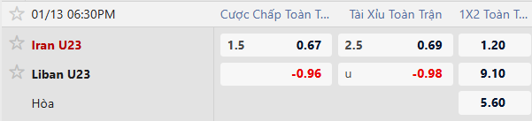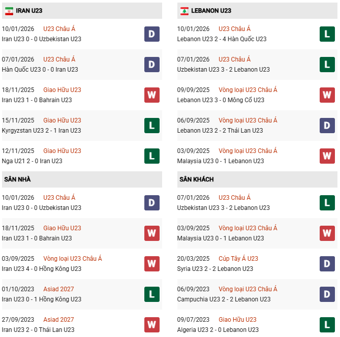Thống kê đối đầu U23 Iran vs U23 Lebanon:
