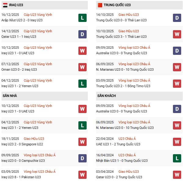 Thống kê đối đầu U23 Iraq vs U23 Trung Quốc: