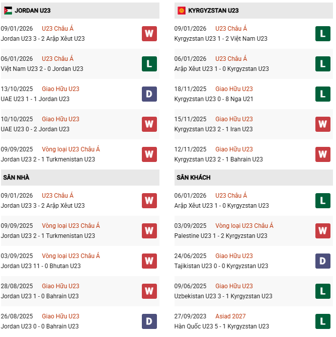 Thống kê phong độ U23 Jordan vs U23 Kyrgyzstan: