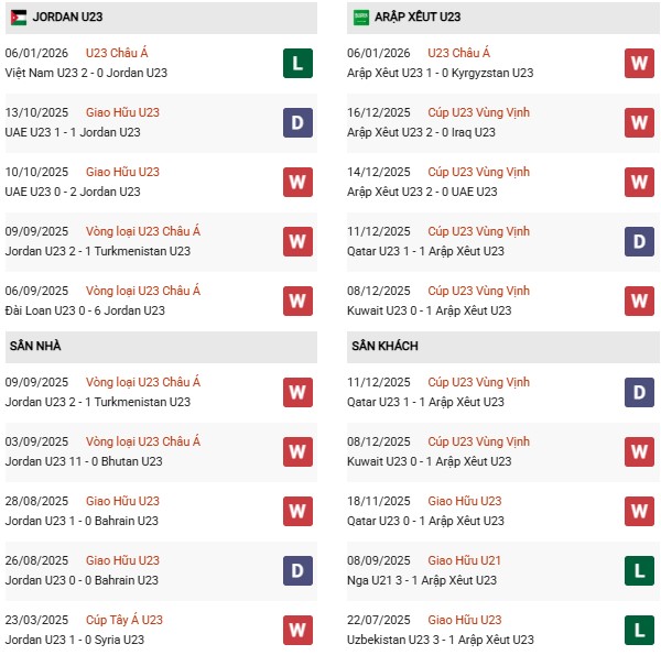 Thống kê đối đầu U23 Jordan vs U23 Saudi Arabia: