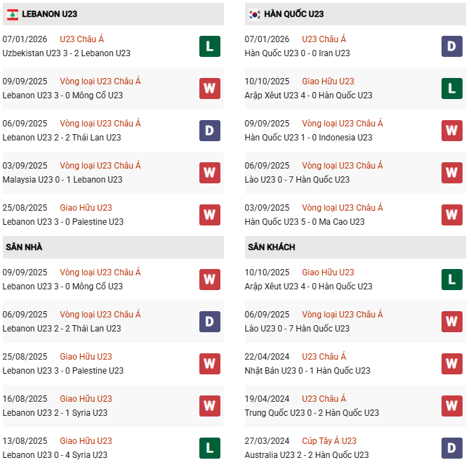 Thống kê phong độ U23 Lebanon vs U23 Hàn Quốc: