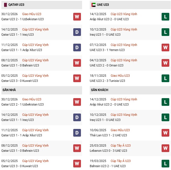 Thống kê phong độ U23 Qatar vs U23 UAE: