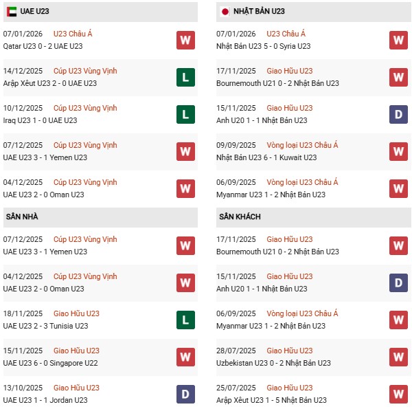 Thống kê phong độ U23 UAE vs U23 Nhật Bản: