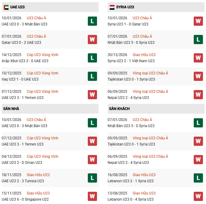 Thống kê phong độ U23 UAE vs U23 Syria: