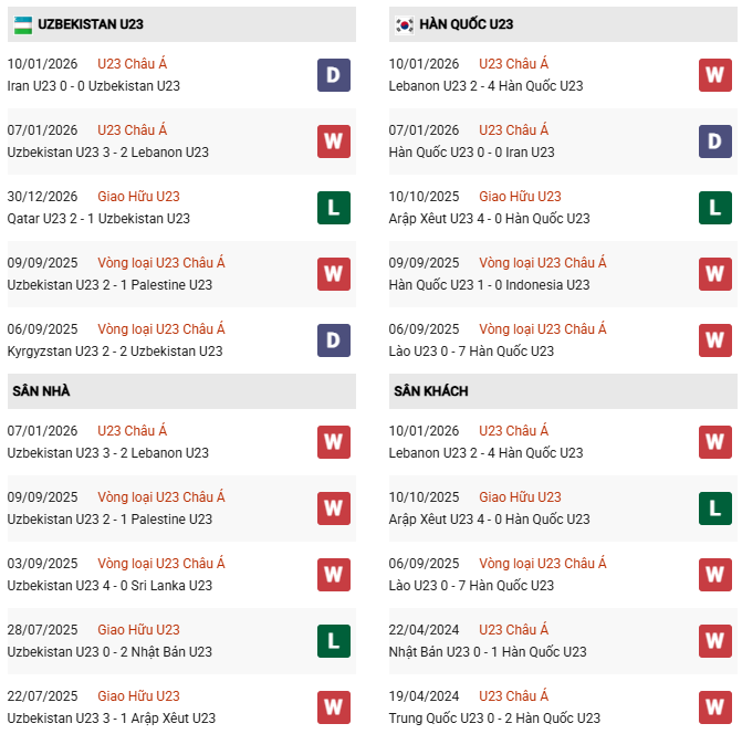 Thống kê đối đầu U23 Uzbekistan vs U23 Hàn Quốc: