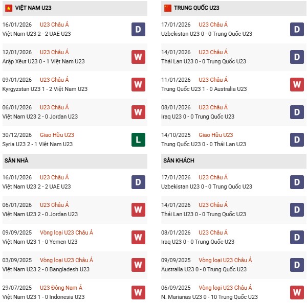 Xét về phong độ, U23 Việt Nam đang cho thấy sự thuyết phục hơn. Đội bóng áo đỏ thắng 4 trong 5 trận gần nhất tại giải, ghi 9 bàn và chỉ để lọt lưới 6 lần, trong đó có những chiến thắng quan trọng trước Saudi Arabia, Jordan và UAE. Trong khi đó, U23 Trung Quốc chủ yếu giành chiến thắng với cách biệt tối thiểu, thiên về lối chơi phòng ngự phản công, dựa nhiều vào sự chắc chắn của hàng thủ và phong độ của thủ môn.