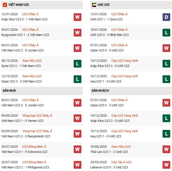 Thống kê phong độ U23 Việt Nam vs U23 UAE: