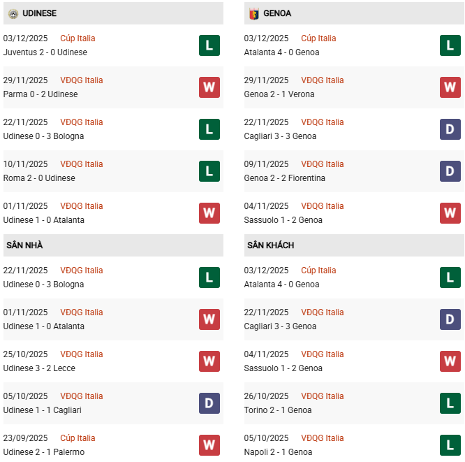 Thống kê phong độ Udinese vs Genoa:
