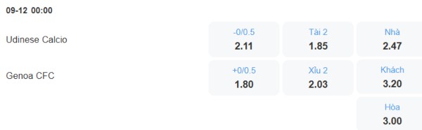 Các trận đấu của Genoa gần đây có khá nhiều bàn thắng (16 bàn trong 4 trận gần nhất) trong khi kèo tổng số bàn thắng trận này chỉ là 2. Cộng với việc Udinese đang không làm tốt ở mặt trận phòng ngự thì trận đấu giữa 2 đội được dự đoán có khá nhiều bàn thắng được ghi.
