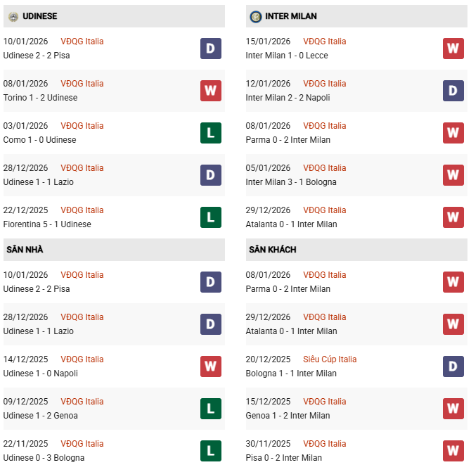 Thống kê phong độ Udinese vs Inter:
