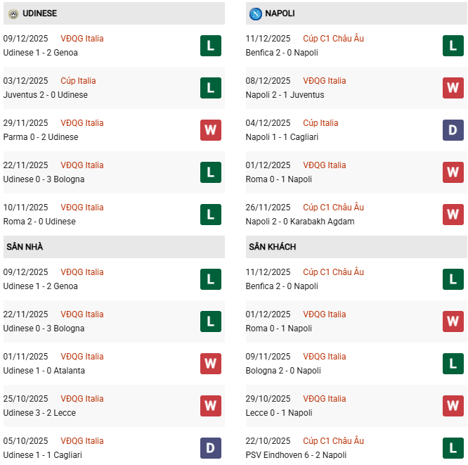 - 10 trận đối đầu gần nhất giữa 2 đội, Udinese hòa 3, thua 7 trước Napoli.