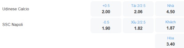 Kèo tổng số bàn thắng trận này chỉ là 2 1/4, con số không cao. Trong khi đó hàng công của cả Udinese và Napoli đều chơi khá ổn thời gian qua và thường xuyên có ít nhất 3 bàn ở các trận đấu của họ. Trận đấu giữa 2 đội vì thế sẽ có khá nhiều bàn thắng,nên chọn kèo Tài chung cuộc.
