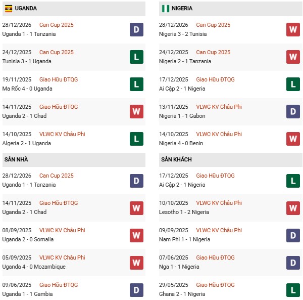 - Trong 3 trận gần nhất, Uganda thắng 2, hòa 1. Nigeria hòa 1, thua 2.