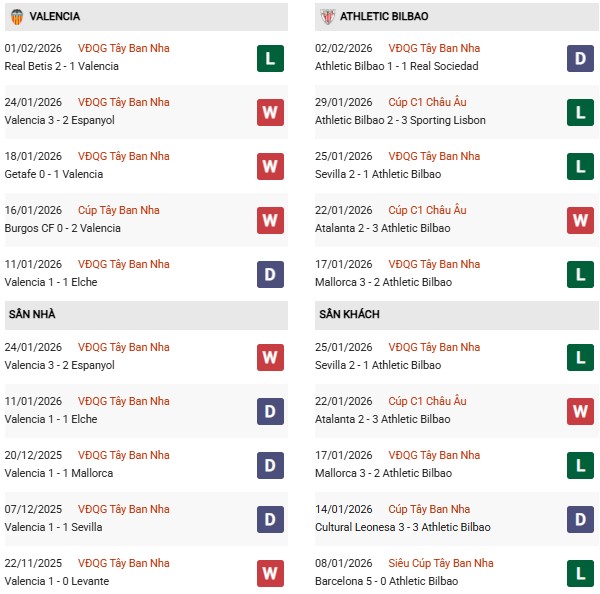 Thống kê phong độ Valencia vs Athletic Bilbao: