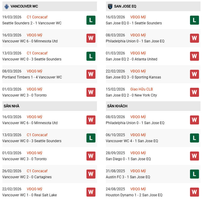 Thống kê phong độ Vancouver Whitecaps vs San Jose Earthquakes: