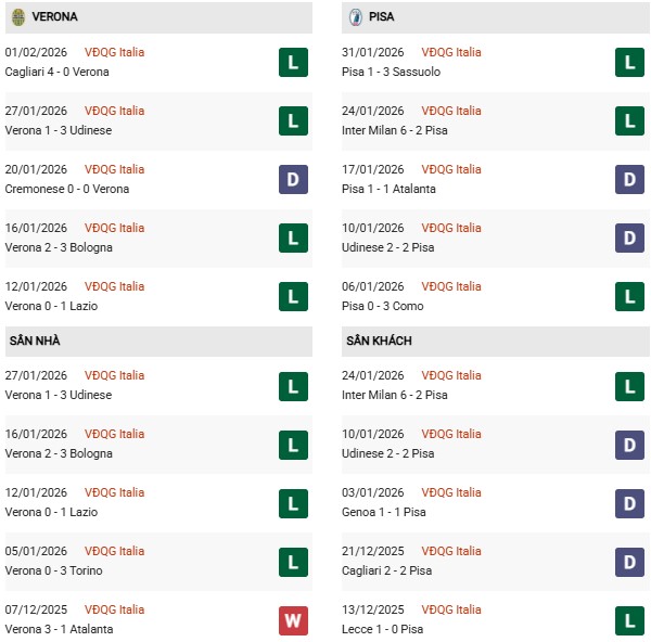 Verona (Hạng 20): Có lợi thế sân nhà Bentegodi, nơi họ từng có thành tích đối đầu rất tốt trước Pisa (thắng 21/30 trận trong lịch sử). Tuy nhiên, phong độ hiện tại rất tệ với 4 thất bại trong 5 trận gần nhất, bao gồm trận thua đậm 0-4 trước Cagliari.