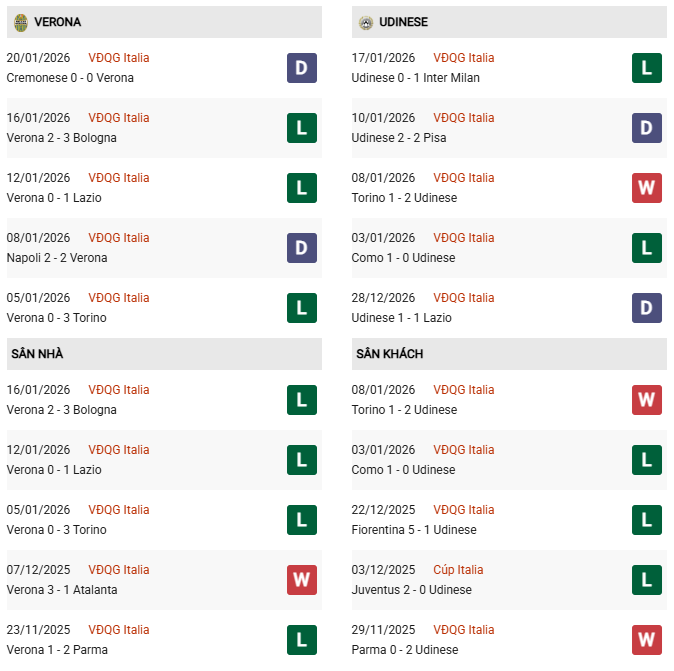 Thống kê phong độ Verona vs Udinese: