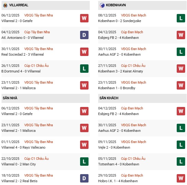 Thống kê đối đầu Villarreal vs Copenhagen: