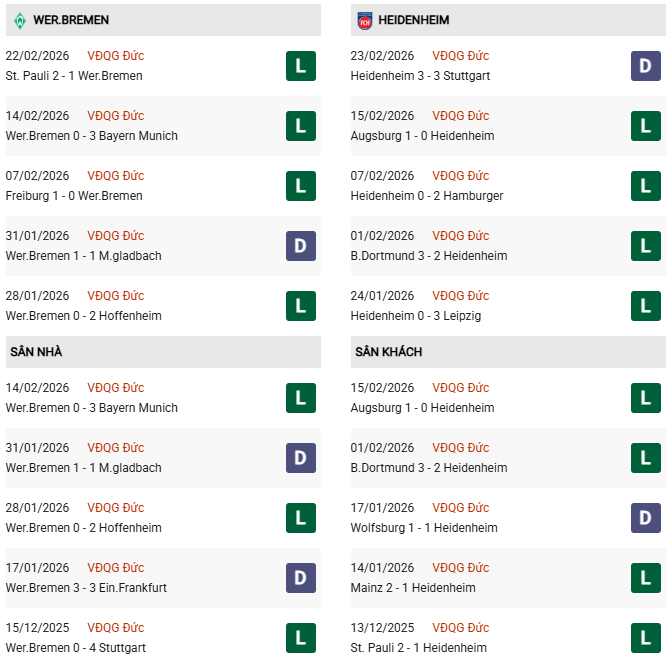 Đánh giá: Với phong độ bết bát của cả hai, khả năng chia điểm là rất cao. Bremen có lợi thế sân nhà nhưng Heidenheim lại cho thấy sự lì lợm hơn ở trận gần nhất.