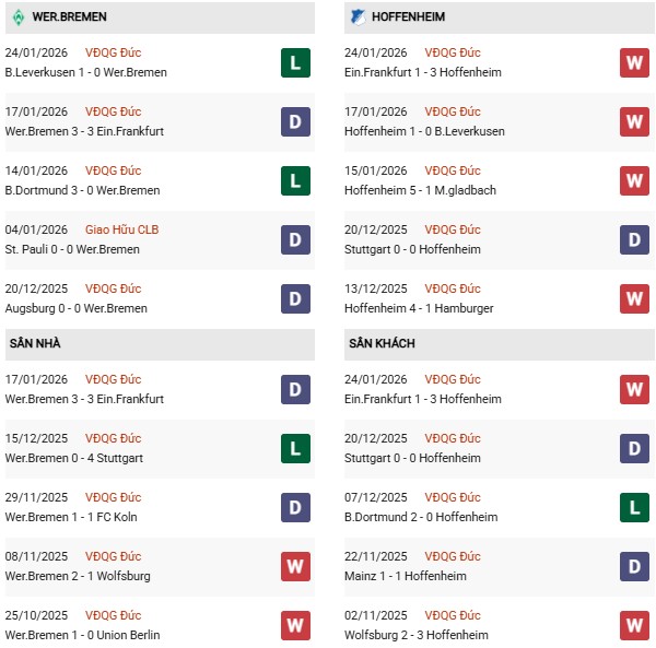 - Trong 5 trận gần nhất, Werder Bremen thắng 1, thua 4 trước Hoffenheim.