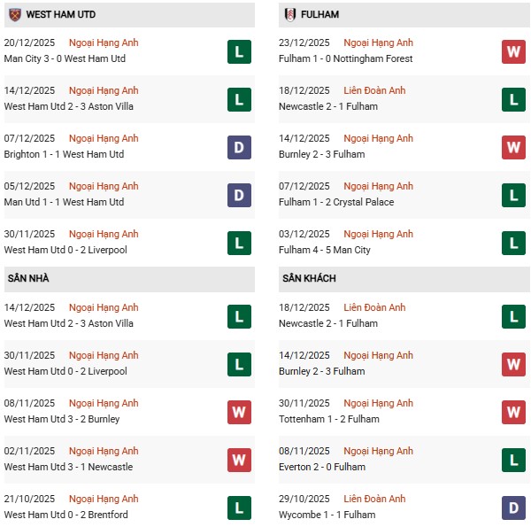 Thống kê phong độ West Ham vs Fulham: