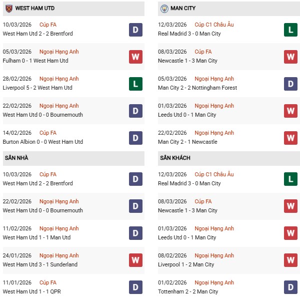 Thống kê phong độ West Ham vs Man City: