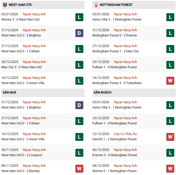 Tuy vậy, ở lần gặp nhau gần nhất vào cuối tháng 8/2025, West Ham đã giành chiến thắng thuyết phục 3-0 ngay trên sân của Nottingham Forest. Đây sẽ là cơ sở để đội chủ nhà có thêm sự tự tin, dù phong độ hiện tại không thật sự ủng hộ họ.