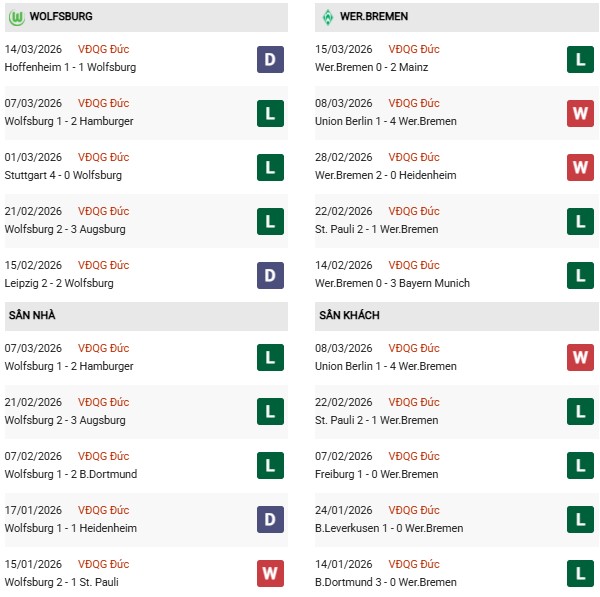 Ngược lại, Werder Bremen tuy cũng không thực sự ổn định (xếp thứ 15 với 25 điểm) nhưng lịch sử đối đầu trên sân Volkswagen Arena đang nghiêng về phía khách. Trong 3 lần gặp gỡ gần nhất tại đây, Bremen thắng 1 và hòa 2, thậm chí đã từng thắng ngược 4-2 tại sân Wolfsburg vào tháng 10/2024. Trận lượt đi mùa này (ngày 08/11/2025), Bremen cũng vừa giành chiến thắng 2-1 trên sân nhà.