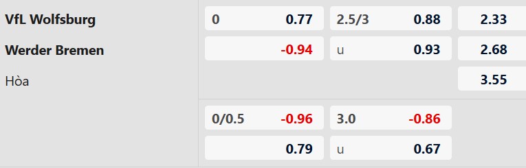 Tổng bàn thắng là số lẻ: Trong 5 lần đối đầu gần nhất giữa Wolfsburg và Werder Bremen, có tới 3 trận kết thúc với tổng bàn thắng là số lẻ (1, 3 hoặc 5 bàn). Riêng Wolfsburg, 11/20 trận thi đấu gần nhất của họ trong mùa giải này có tổng bàn là số lẻ. Trận này nhiều khả năng số lần lưới rung cũng sẽ không chia hết cho 2.