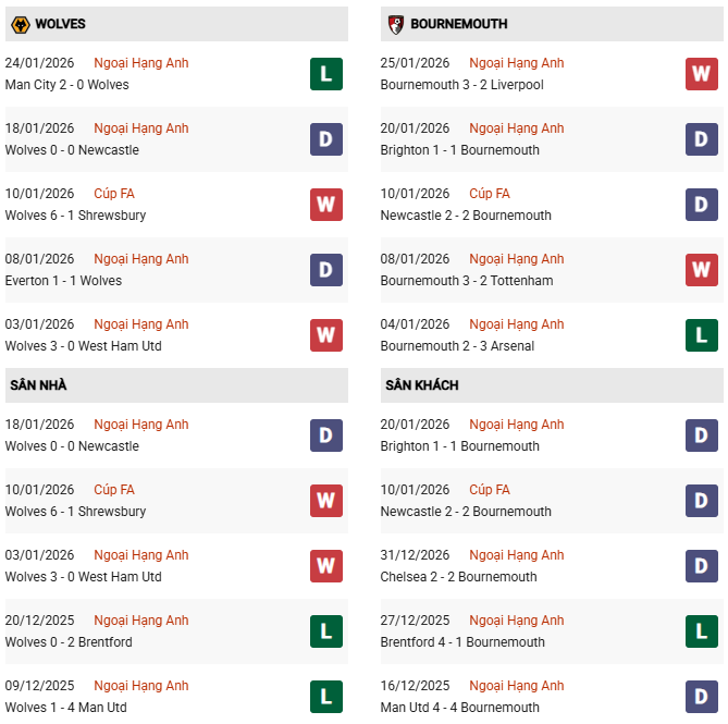 - Wolves thắng 4 thua 4 và hòa 2 trong 10 lần gần nhất gặp Bournemouth.