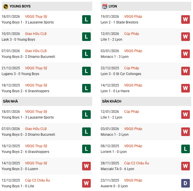 Thống kê phong độ Young Boys vs Lyon: