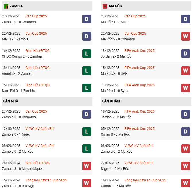 Ở lần chạm trán gần nhất tại vòng loại World Cup khu vực châu Phi (tháng 9/2025), Ma Rốc đã giành chiến thắng 2-0 ngay trên sân của Zambia. Kết quả này càng củng cố niềm tin vào khả năng áp đảo của Ma Rốc ở cuộc tái đấu sắp tới.