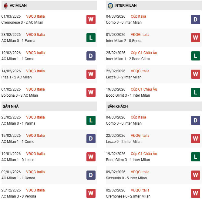 Thống kê đối đầu AC Milan vs Inter Milan: