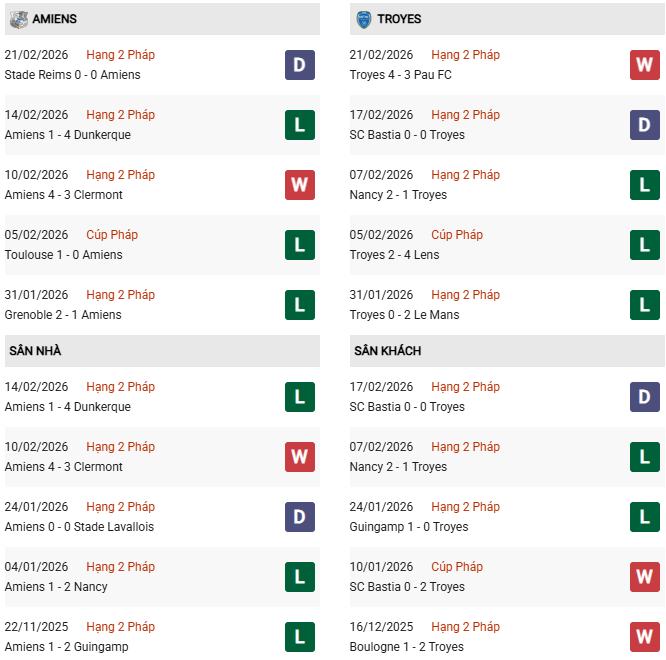 Thống kê phong độ Amiens vs Troyes: