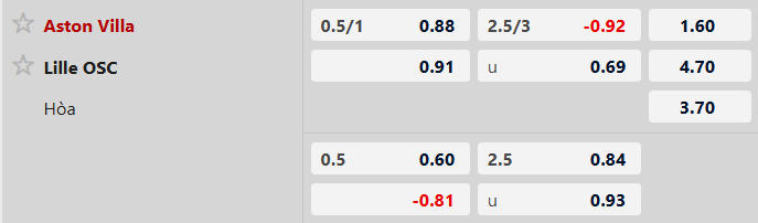 - Aston Villa thắng 2/3 trận đối đầu vừa qua truoqcs Lille.