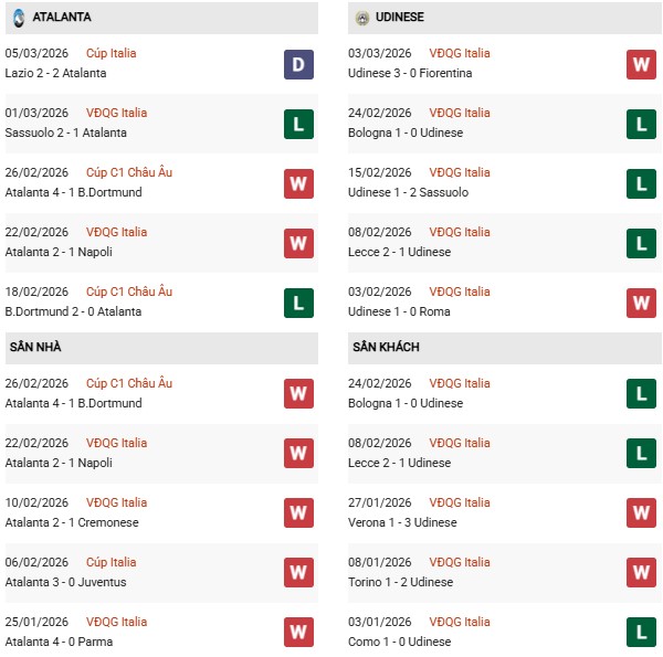 Trong khi đó, Udinese bước vào trận đấu với tâm lý khá hưng phấn sau chiến thắng thuyết phục trước Fiorentina. Họ cho thấy khả năng tận dụng cơ hội tốt và sự hiệu quả trong khâu dứt điểm. Tuy nhiên, vấn đề của Udinese lại nằm ở bản lĩnh sân khách. Những chuyến hành quân xa nhà thường không mang lại kết quả như mong đợi, đặc biệt khi phải làm khách trước một Atalanta chơi bùng nổ tại tổ ấm của mình.