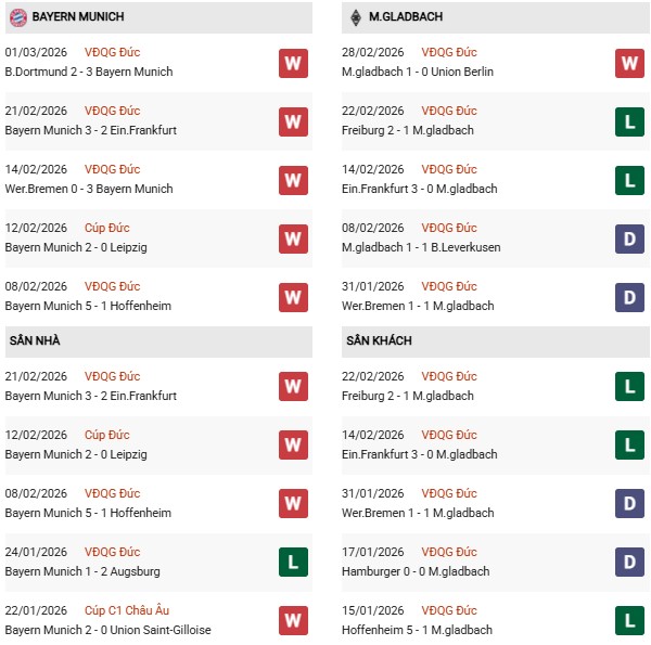 Thống kê phong độ Bayern Munich vs Monchengladbach: