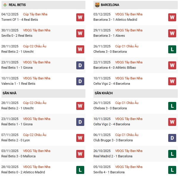 Thống kê phong độ Betis vs Barcelona: