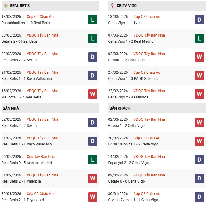 Thống kê phong độ Betis vs Celta Vigo: