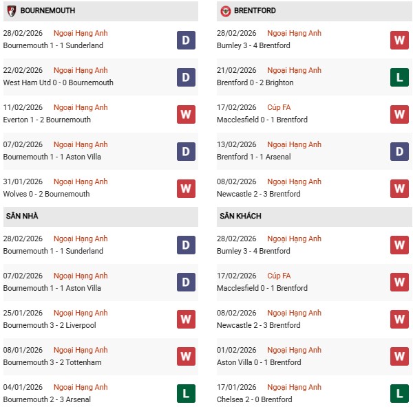 Trạng thái phong độ: Bournemouth vừa có 2 trận hòa liên tiếp (1-1 trước Sunderland và 0-0 trước West Ham). Trong khi đó, Brentford cũng rất bản lĩnh khi xa nhà với 7 chiến thắng trong 8 trận khách gần đây.