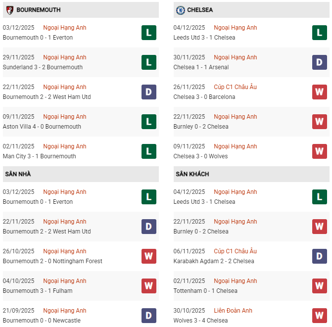 Thống kê phong độ Bournemouth vs Chelsea: